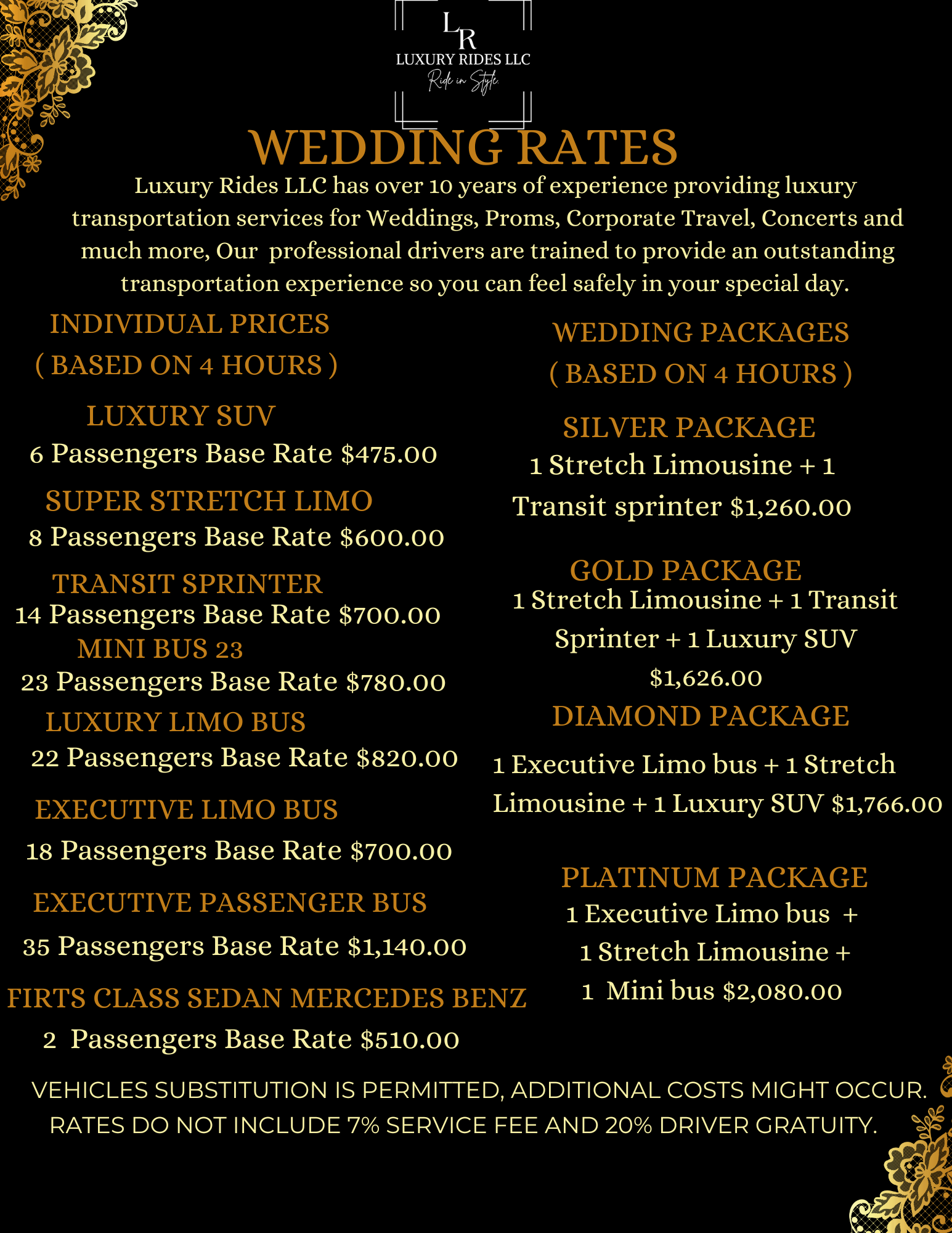 Los servicios de bodas de Luxury Ride harán realidad la boda de sus sueños, creando momentos inolvidables que atesorarán toda la vida. Con un profundo compromiso con la atención al detalle y pasión por crear experiencias únicas, ofrecemos una gama de servicios a la medida de sus necesidades. Desde la consulta inicial hasta los momentos inolvidables de su día especial, nuestros dedicados profesionales trabajarán estrechamente con usted para garantizar que cada aspecto de su boda refleje su visión y estilo personal.